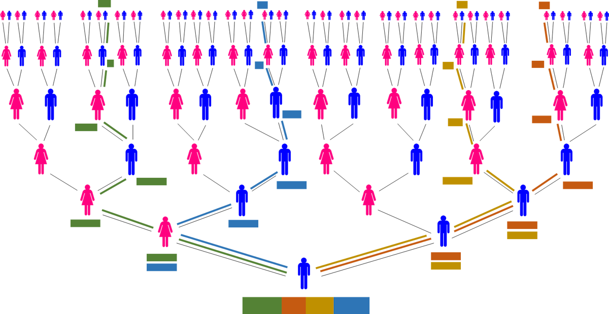 "Who are the medieval people whose DNA you inherited? Each fragment of your DNA descends from a random line up your family tree – father’s mother’s mother’s father and so on – at each generation in the past, selecting at random one of two parents. The more lines in your family tree that reach a certain medieval person, the more likely you are to inherit DNA from that person."